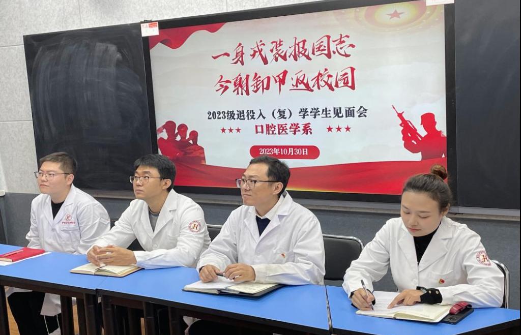 以习近平新时代中国特色社会主义思想为指导,全面落实党的二十大报告中关于强军思想的重要指示精神,加强系部退役大学生士兵思想政治引领,鼓励退役大学生士兵继承和发扬部队光荣传统,激发爱国热情和爱校情怀,发挥骨干带头作用。10月30日上午,口腔医学系在行政楼召开以“一身戎装报国志,今朝卸甲返校园”为主题的2023级退役入(复)学学生见面会。口腔医学系书记付广权、教务处厉永鹏、口腔医学系2023级辅导员及18名退役复学学生参加会议。