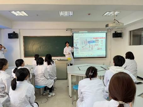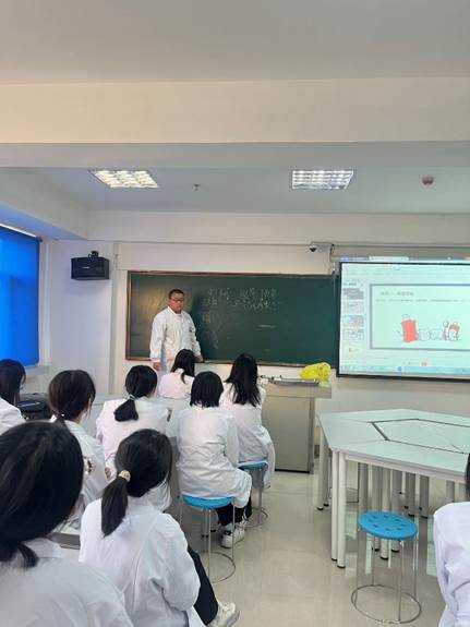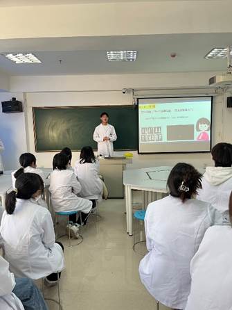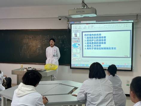 第四部分内容为“四手操作”,由助教赵欣雨作为主讲进行讲解,赵欣雨首先讲解“四手操作”的理论知识,随后又随机抽选一名助教和她配合进行实践演示,在演示过程中,主要展示了“器械传递”过程,即医生和护士如何传递器械,最后以护士在“四手操作”中的体位和位置关系,结束了本次“翻转课堂”的助教讲解环节。