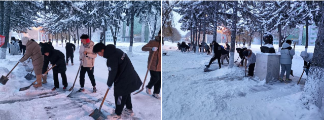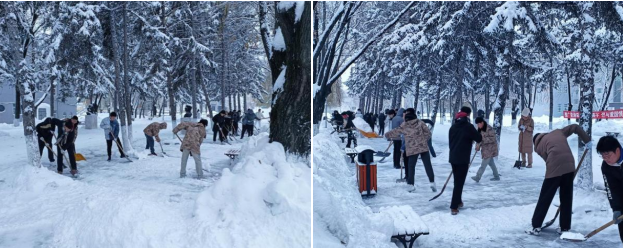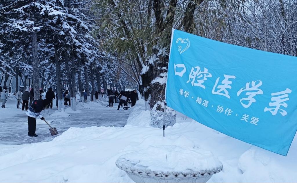 大雪伴着寒风,一夜白了大地,银装素裹的校园显得格外美丽,但堆满积雪的路面却给师生们的出行带来了很多不便和安全隐患。为方便师生出行,口腔医学系党支部书记付广权发起“齐心协力除积雪 劳动教育懂担当”的倡议,口腔医学系23级学生积极响应号召,踊跃报名参加。11月9日早6时,在口腔医学系党支部书记付广权带领下,50名学生志愿者对阿城校区校园主干道的积雪进行了及时清扫,确保了校园道路安全畅通。同时陈武禄、鲁刚、齐冀、张佳音四位党员教师也参加了此次清雪活动;物业公司的郭经理为此次清雪活动提供了清雪工具。