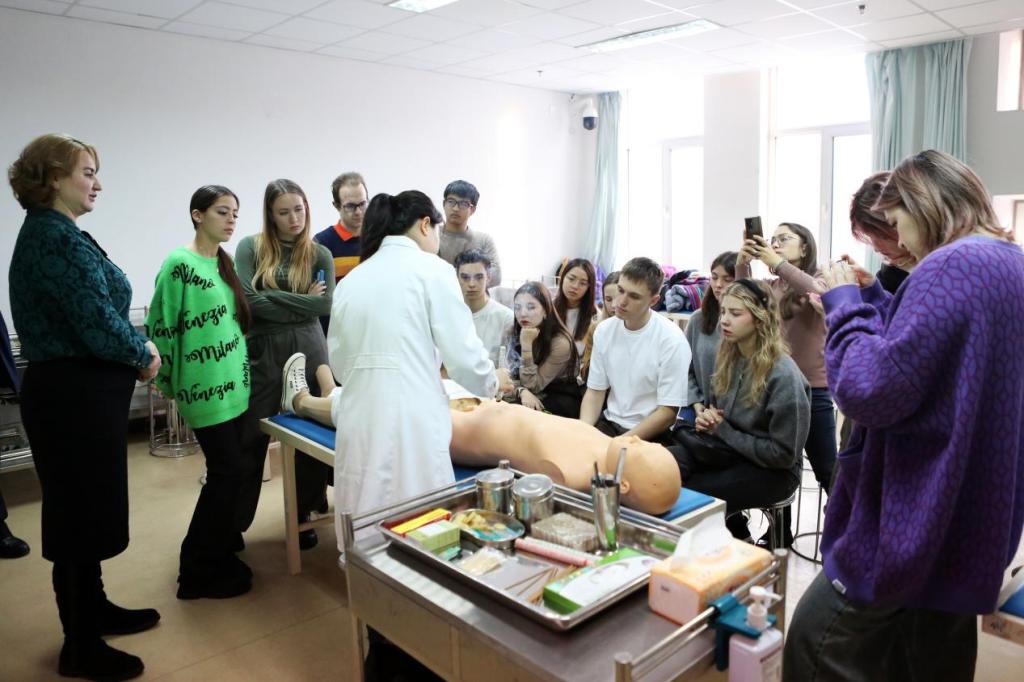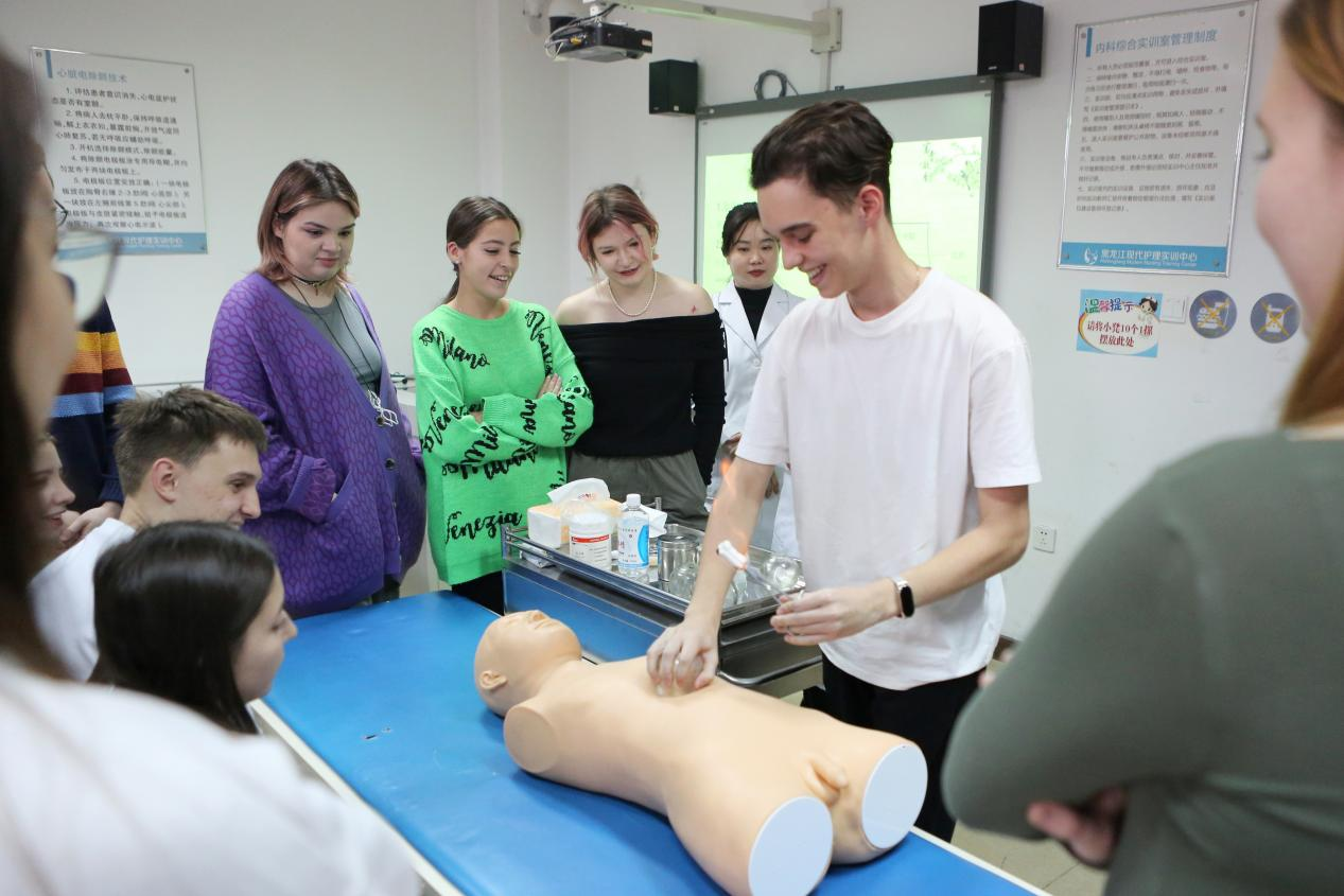 随后,在我校南岗校区护理实训楼四楼,康复医学系老师为俄罗斯太平洋国立医科大学、莫斯科国立第一医科大学14名学生进行中医适宜技术培训。培训中,学生们积极与教师互动,对我校的先进教学设施和实践教学水平表示赞赏,同时更加深入地了解了我校办学的独特魅力和优势。