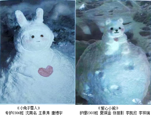 《小兔子雪人》、《爱心小熊》那红红的脸蛋、圆圆的身体,真是憨态可掬,手捧爱心静静地待在雪地里,变得更加可爱了,表达着对这个充满活力的校园的喜爱之情。