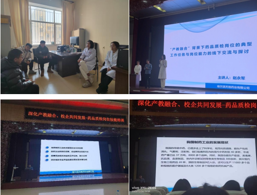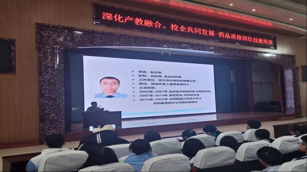 为深入贯彻落实《黑龙江护理高等专科学校关于全面推进康养护特色鲜明的高水平技术技能型高等职业学校建设的实施意见》和《黑龙江护理高等专科学校关于全面推进“十四五”重点规划任务实施方案》,深化产教融合,校企共同发展,2023年12月4日下午,药学系邀请药品生产企业资深的质量经理、质量授权人赵永军为学生进行培训。赵永军经理在质检岗位上经验丰富,曾作为吉林省中医中药研究院的中药研究员负责中药成分研究及新药质量标准的起草,在药企质量系统作为技术研发员负责生产工艺改进、质量标准提升研发等。