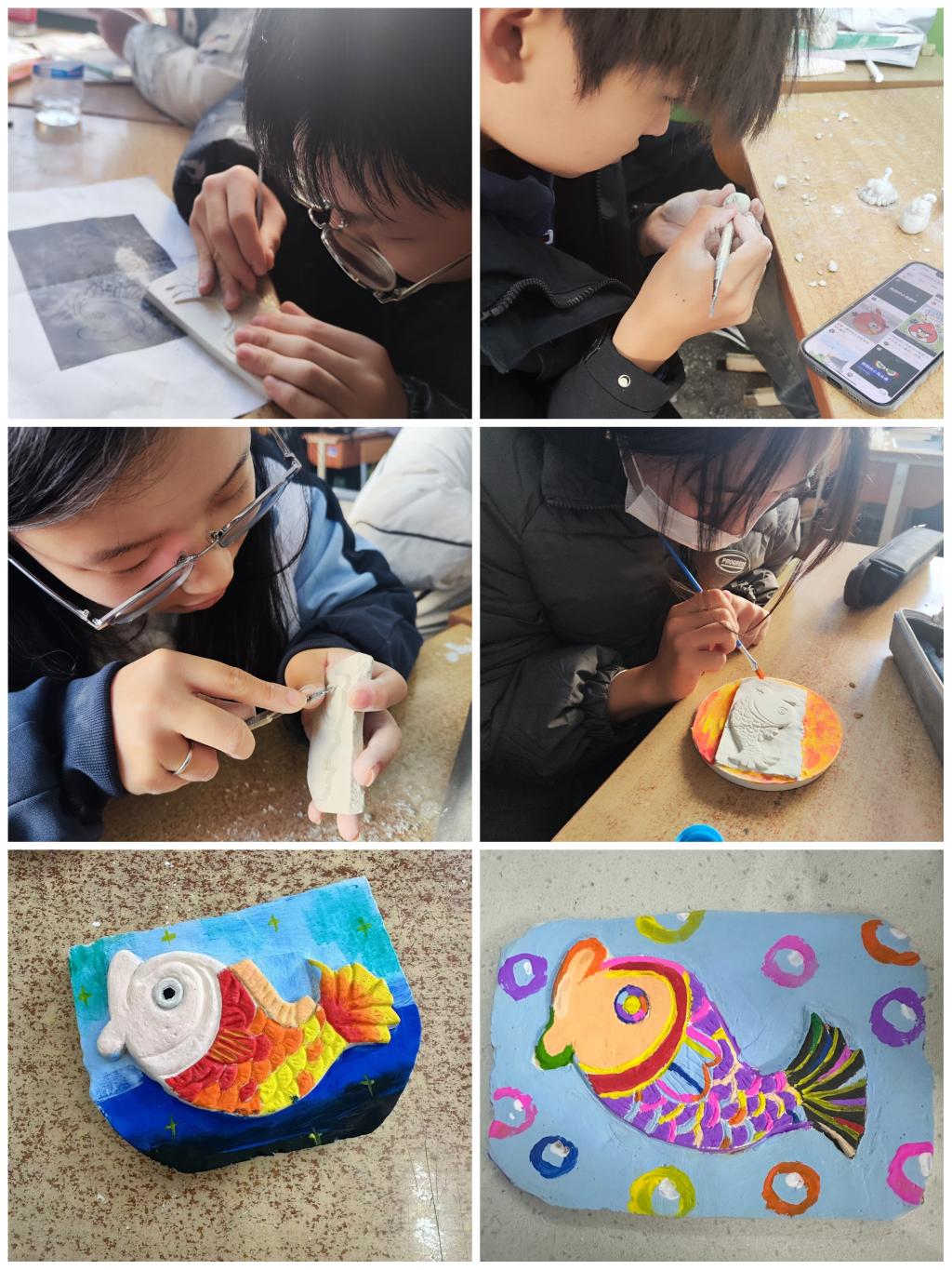 口技专业的学生们,用雕刻刀在石膏板上,雕刻出一条条精美的鱼儿,在制作的过程中,结合自身的专业性质,锻炼了自己的动手能力、提高了自己的审美,同时也丰富了生活,学会用美的眼睛来观察事物。