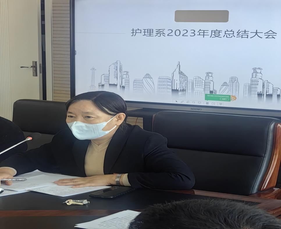 首先,护理系书记宗晓对系部全年工作从党建引领、完成的教学任务、精品课程建设、教育教学改革、人才培养质量、师资队伍建设、辅导员队伍建设、学生管理工作、系部全年成果展示几个方面做了全面总结。