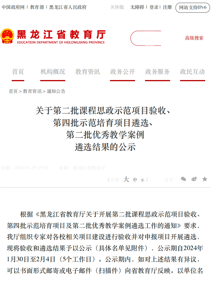 近日,黑龙江省教育厅公布了第四批课程思政示范项目立项建设名单(http://jyt.hlj.gov.cn/jyt/c110481/202401/c00_31706403.shtml),我系刘琬一老师团队的《人际沟通与礼仪》课程成功入选(继续教育类),填补了我系课程思政项目的空白。