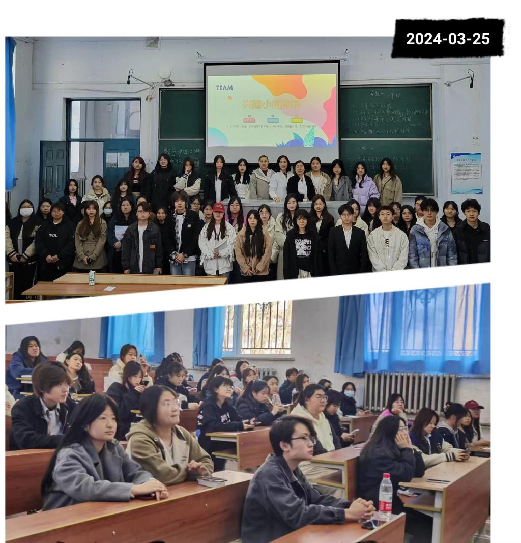 为助力天使校园文化建设,基础教育部人文修养教研室于3月25日在阿城校区行政楼1楼阶梯教室启动“有声文学”、“追梦天使”、“华韵传承”兴趣小组的招新活动,人文修养教研室王娜、毕子家、晁亮三位老师以及23级各班学委、人文课代表参加活动。