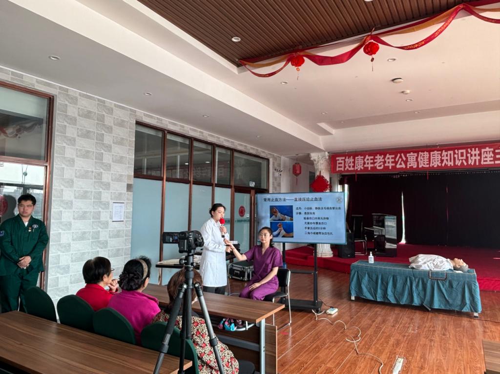 临床医学系教师韩琳针对老年人日常生活中易出现跌扑损伤现象讲解了日常创伤救护知识。她主要讲解了常用的加压止血,止血带止血、三角巾或衣物进行止血的绞紧止血、头部出血三角巾帽式包扎等操作方法。通过和李鹏老师的模拟演示和手把手教学的方式让工作人员学习和实操止血、包扎等应急措施。