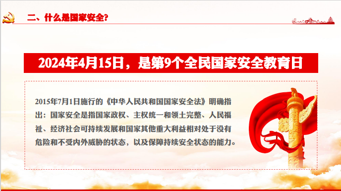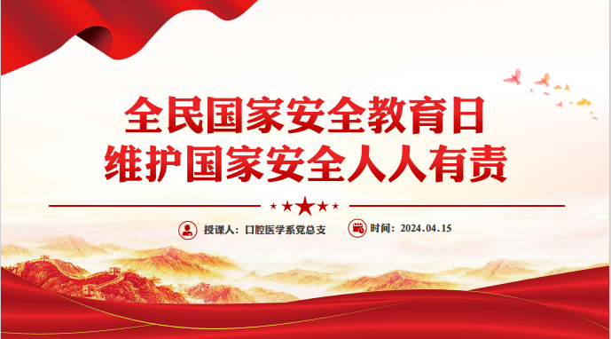 为深入贯彻落实关于全面加强国家安全教育的重要指示精神,推动国家安全宣传教育深入开展,增强广大师生国家安全意识和素养,口腔医学系围绕“总体国家安全观·创新引领十周年”这一主题,于4月15—24日举办了一系列丰富多彩的国家安全教育日活动。