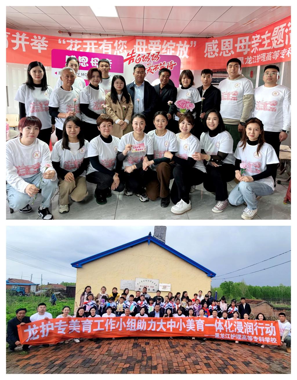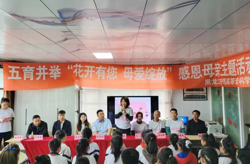 为弘扬中华民族传统美德,践行社会主义核心价值观,倡导五育并举,5月11日,黑龙江护理高等专科学校联合莲花镇中心小学、基地港湾共同举办“五育并举 感恩母亲”活动,营造孝老爱亲、尊师重教的良好社会氛围。我校副校长杨丽妲、校办公室主任王凤新、团委书记孙健飞、基础教育部主任周佳、望奎县团委书记刘厚琦、莲花镇中心小学校长梁开军、基地港湾负责人杨公立及我校国家职业教育教师创新团队、教务处、思政部、体育部、基础教育部的部分教师参加活动,美育教研室主任赵博鑫主持活动。