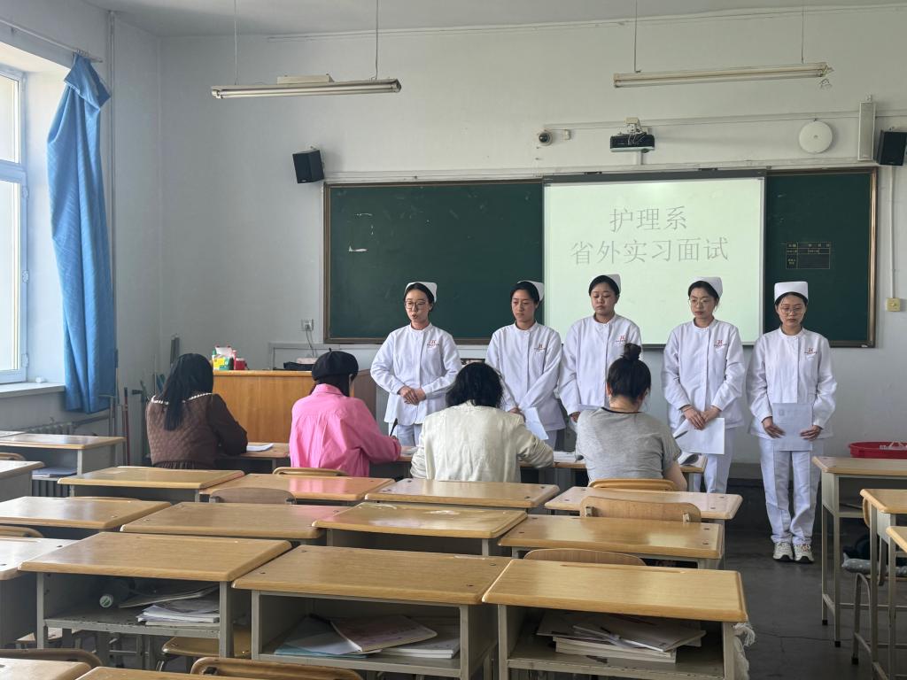 为选拔优秀学生前往省外实习,拓展就业渠道,促进校企合作共育人才,2024年5月8日12时,护理系在护理楼506教室召开选拔护理系省外实习生面试会议。会议分线下和线上两种形式。护理系书记宗晓、护理系主任吕波、护理系实习老师韩梅及护理系相关辅导员老师到场指导实习面试工作。会议由护理系辅导员徐寅主持。此次面试共为来自北京、杭州等9家医院选拔实习生,护理系护理专业、涉外护理专业、口护专业共76名同学参加面试。