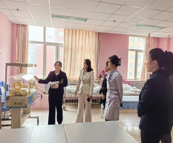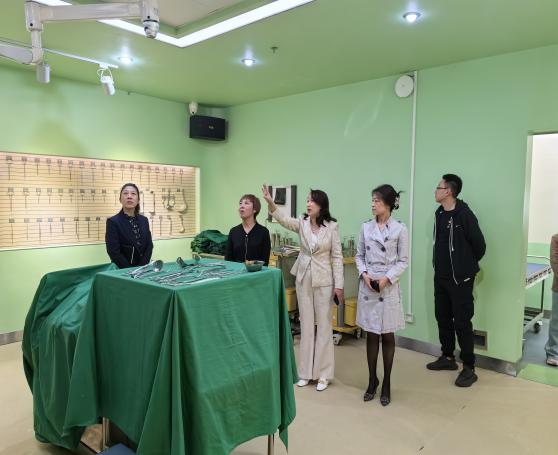 在护理系主任吕波的引领下,道里区抚顺街道办事处工委副书记张威一行参观了南岗校区实训中心护理实训室、虚拟仿真实训室、新生儿病房、手术室、ICU病房等,直观的体验到我校对于全生命周期护理教学理念。