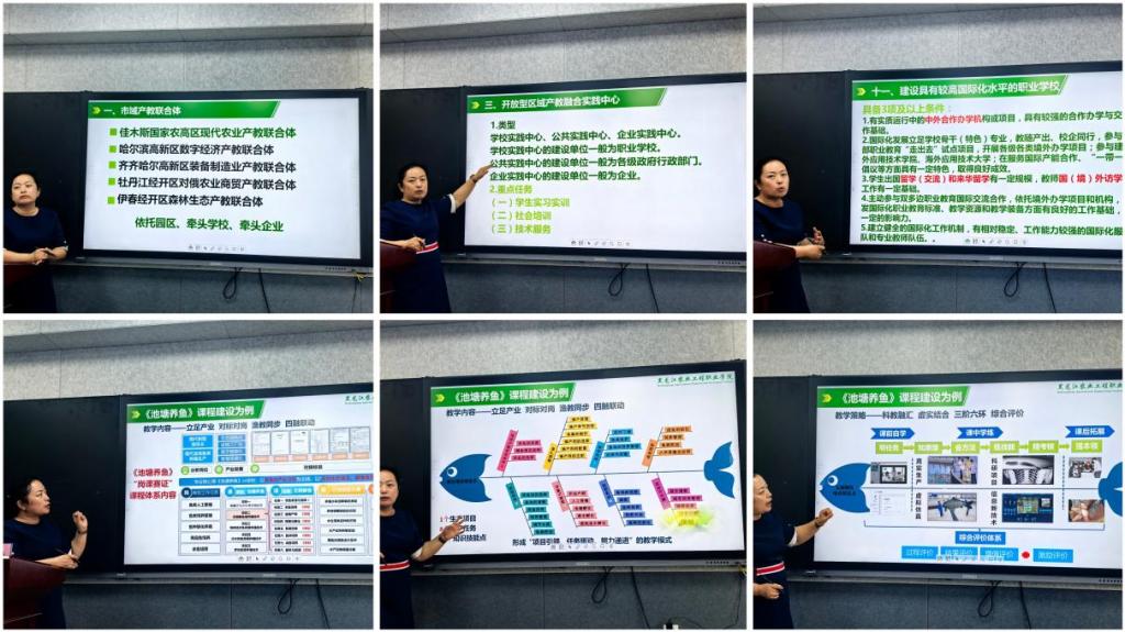 翟教授特别强调了产教融合、校企合作在职业教育发展中的核心地位,要通过打造市域产教联合体、行业产教融合共同体,建设开放型区域产教融合实践中心等措施,促进教育与产业的深度融合。同时,她也分享了黑龙江农业工程职业学院在职业教育体系建设改革方面的具体实践和成效。在讲座的后半部分,翟教授详细解析了职业教育专业教学资源库、职业教育信息化标杆学校、职业教育示范性虚拟仿真实训基地等建设标准和实施路径。翟教授通过《池塘养鱼》等课程建设的实例,展示了项目化课程改革的创新思路和实践成果,为我校师生提供了宝贵的借鉴和启示。此外,翟教授还就职业教育优质教材的建设、具有国际影响的职业教育标准、资源和装备建设以及建设具有较高国际化水平的职业学校等方面进行了深入探讨,她鼓励我校师生积极参与到职业教育的国际交流与合作中,提升学校的国际化水平。讲座结束后,翟教授与在场老师进行了互动交流,回答了老师们关于虚拟仿真、课程建设、教学大赛、产教融合等多方面的问题。