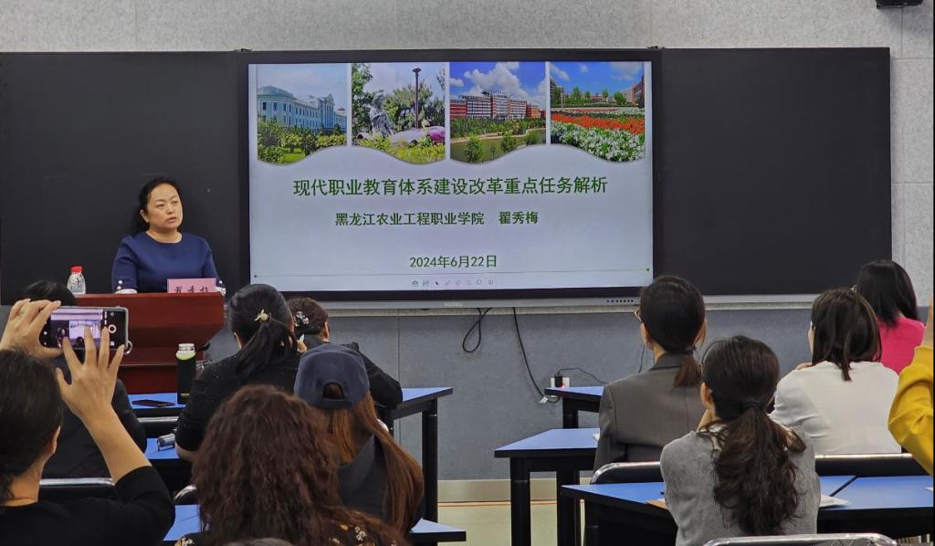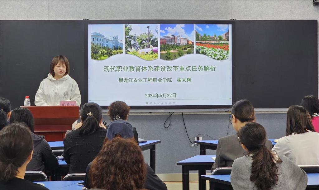 为深入贯彻落实中共中央办公厅、国务院办公厅印发的《关于深化现代职业教育体系建设改革的意见》以及教育部办公厅发布的《关于加快推进现代职业教育体系建设改革重点任务的通知》要求,结合“提质培优”和“双高”建设任务要求。6月22日,我校荣幸邀请到黑龙江农业工程职业学院翟秀梅教授进行主题为“现代职业教育体系建设改革重点任务解析”的讲座。讲座由副校长杨丽妲主持,各系部主任、副主任、教研室主任、专业及专业群带头人、“双高”建设负责人、国家级教师创新团队成员等参加此次讲座。
