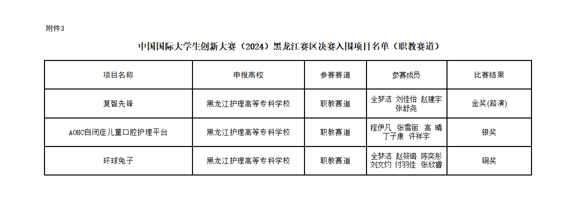 7月20日,中国国际大学生创新大赛(2024)黑龙江赛区决赛在哈尔滨师范大学圆满落幕。口腔医学系共组织207支队伍参加校赛,3支代表队入围省赛,经过激烈角逐,“复智先锋”获职教赛道金奖,参与20日排位赛,“AOHC自闭症儿童口腔护理平台”获职教赛道银奖,“环球兔子”获职教赛道铜奖。
