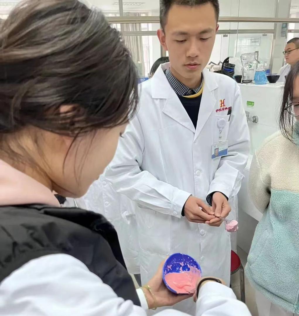 活动成效:在随后的实践环节,助教们两两一组互相配合地进行印模制取和石膏模型的灌制,在实践中发现和解决问题,最终,每位同学在得到了一份自己独家定制的口腔模型同时,也熟练地掌握了印模的制取技巧及石膏模型灌注的操作技能要点。