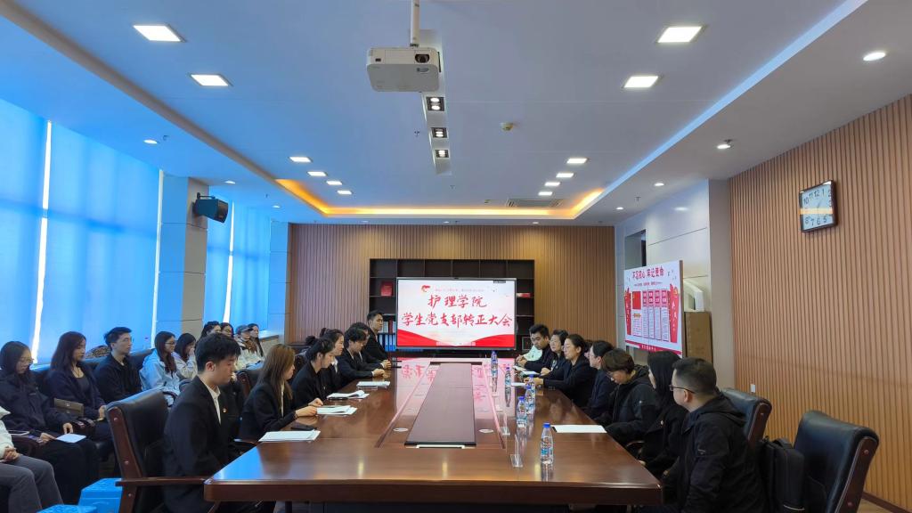 学生党支部预备党员转正大会上,牡丹江医科大学护理学院学生党支部书记曹文超对宗晓书记一行的到来表示欢迎,并主持21级本护转段到牡丹江医科大学的四名预备党员学生转正大会,会上艾卓扬老师和曹文超老师分别对四名同学预备期的表现表示肯定。此外,双方还在学生培养、实习就业等方面进行了广泛的交流。