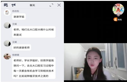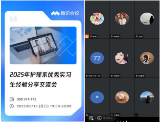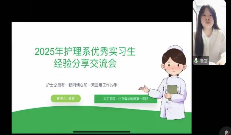 护理系实习管理教师韩梅和辅导员谢蕊两位老师主持会议,线上分享突破了时空限制,让更多学生有机会汲取前辈经验。四位主讲人依次分享,结合自身经历,将实习中的酸甜苦辣娓娓道来。