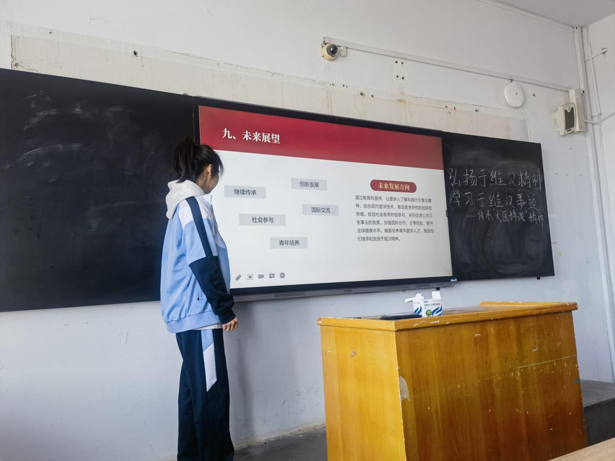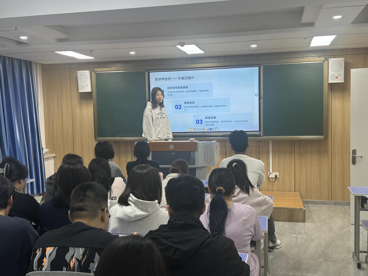 介绍于维汉生平、精神内核、精神影响等,经过互动问答等环节,与同学们探讨如何弘扬于维汉精神并应用于现代医学和公共卫生领域,主要讲述于维汉的科研精神和医学伦理,激励年轻一代医学生。通过图片、文字、视频等媒体相关报道,制作文章等内容,以此为媒介,广泛传播于维汉精神和事迹。