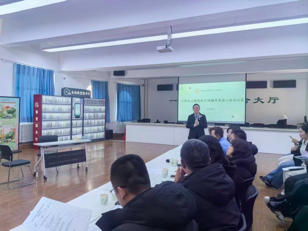 11月25日护理系邀请了哈师大马林教授为辅导员做了一次心理危机干预培训,培训后进行了比赛初试环节,按笔试分数高低,最终8名选手进入决赛。决赛是以模拟情景再现形式,与助演学生进行限时谈话,决赛题目由基础教育部直属党支部书记周立超出题。