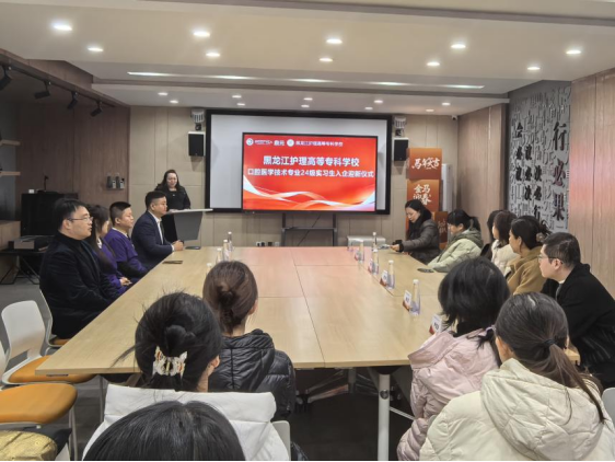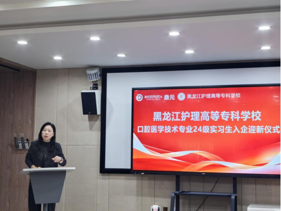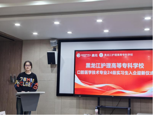 为进一步深化产教融合,提升学生的实践技能与职业素养,以优质顶岗实习带动精准就业,近日,口腔医学技术专业实习学生在口腔医学系党总支书记隋红、系综合办公室主任陈慧、招生就业处副科长陈亚丹、口腔医学技术教研室主任任旭及辅导员尹煜燊老师的带领下前往黑龙江鼎元牙科科技有限公司,正式开启为期八个月的顶岗实习。为确保学生顺利融入企业环境,实习单位特意为实习学生举办了热烈而隆重的欢迎仪式。会议由鼎元牙科科技总经办负责人张芷瑄主持。