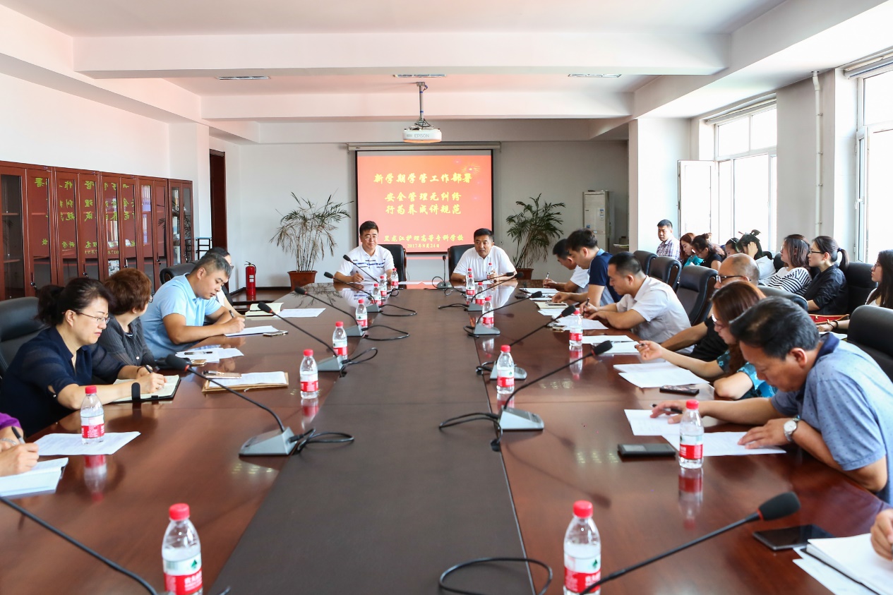 2017年8月24日上午8点30分,我校召开了以“安全管理无纠纷,行为养成讲规范”为主题的新学期学管工作部署会议。校长、夏广军副校长、程合坤处长、各系书记以及学工处、辅导员全体参加了本次会议。