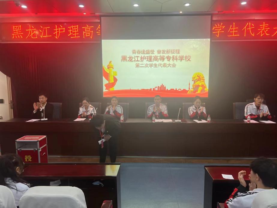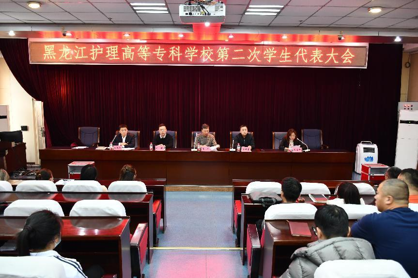 2023年12月8日,下午1点,黑龙江护理高等专科学校第二次学生代表大会在南岗校区实训楼六楼会议室顺利召开,阿城校区、松北校区设有分会场,参会代表共计120人。