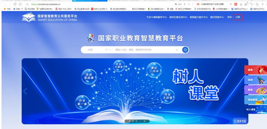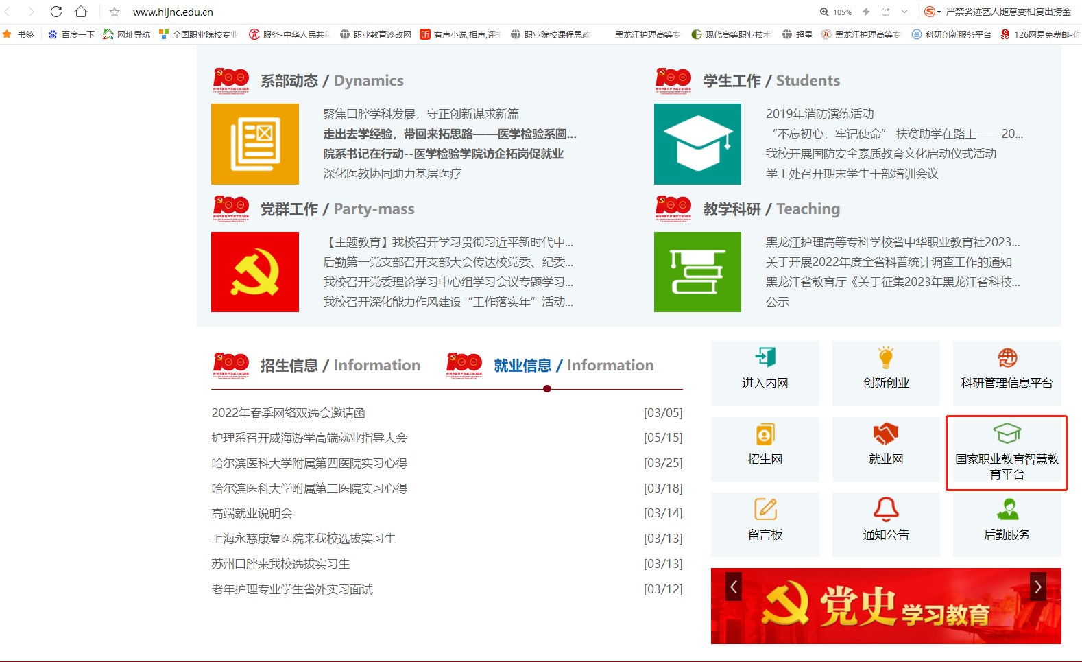 第一步:在校园网主页找到国家职业教育智慧教育平台入口,点击进入,如图: