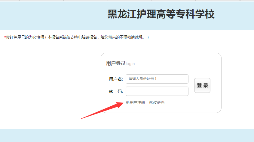 考生需登录黑龙江护理高等专科学校官网(http://www.hljnc.edu.cn/)后,点击悬浮窗口“单独招生征集志愿报名入口”,凭考生本人身份证号注册。具体流程如下: