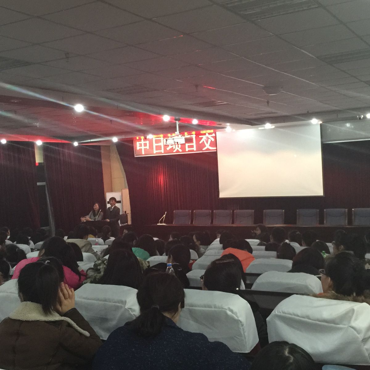 山口先生和刘女士还为我校学生做了日本文化讲座。详细地介绍了日本的学习、生活、工作情况及日本的风土人情。风趣的讲解和学生积极踊跃的互动把现场气氛推向了高潮。同学们对此项目表现出极大的兴趣。