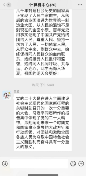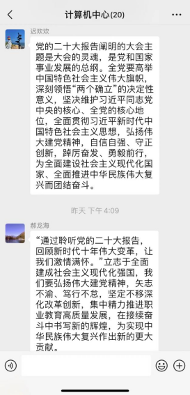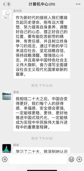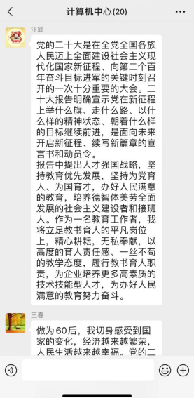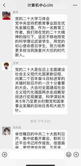 计算机中心组织部门教工20人进行党的二十大精神线上学习活动,并纷纷在群内讨论心得,大家感悟深刻,习近平总书记在党的二十大报告中,指明了中国共产党新征程的路线方针政策。在教学科研工作中,要学先学深,深入领会党的二十大报告的精神实质。结合部门工作和专业特点,让党的二十大精神进思想进课堂。