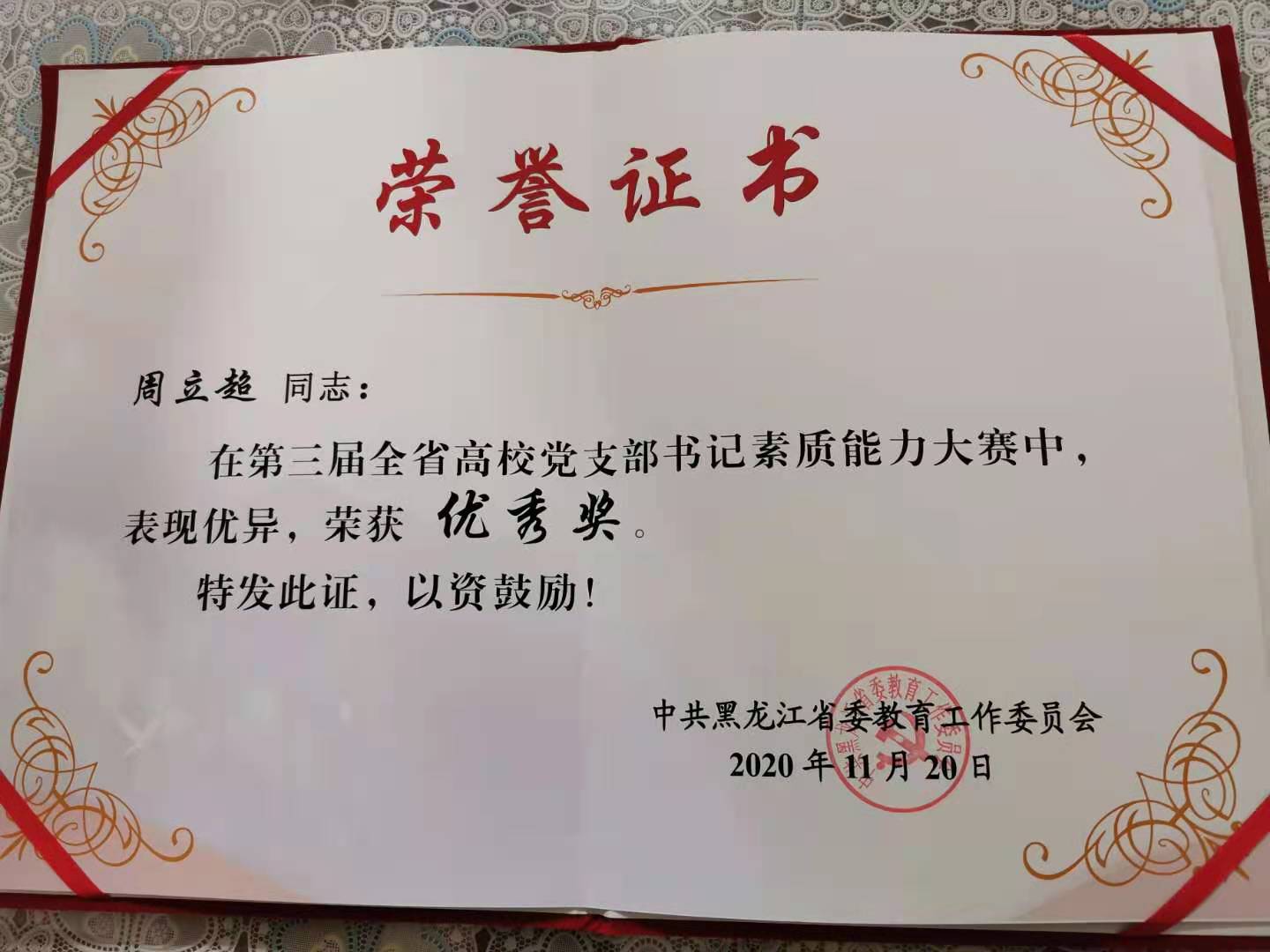 11月18日至20日,由黑龙江省委教育工委主办的第三届黑龙江省高校党支部书记素质能力大赛在黑龙江大学举行。本次大赛旨在持续提升全省高校党支部书记素质能力,全面展示“双带头人”培育工程实施成效,充分发挥党支部书记“头雁效应”。我校选派人文基础党支部书记周立超代表学校参加比赛。在初赛基础知识测试、方案设计和典型案例评比环节中,周立超沉着应对,发挥出色,顺利晋级半决赛,最终获得宝贵的优秀奖,成绩取得新突破。全校党支部书记要以此次大赛为契机,不断提升政治能力和党务工作能力,加强党支部标准化、规范化建设,全面提升党支部建设质量。充分发挥党组织示范引领作用,促进党建与教育管理深度融合,成为师生最值得信赖的组织依靠。