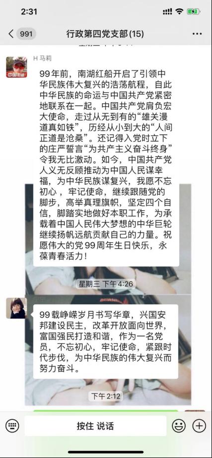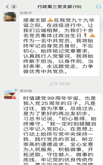 为深入强化党员的身份意识和政治意识,增强党员的责任感和使命感,充分发挥党员先锋模范作用,学校党委围绕“庆祝中国共产党成立99周年”,以线上或线下形式,继续组织开展党员过“政治生日”活动。 将“政治生日”与支部生活相结合,重温入党誓词,谈领悟感受,净化心灵,永葆初心,引导党员时刻不忘自己的“第一身份”,积极发挥示范引领作用。实现“几名党员过生日,全体党员受教育”,激发了全体党员的政治热情,提高了党员的党性修养,增强了党员的使命感和进取精神,广大党员教工纷纷表示,对党忠诚要体现在贯彻党中央决策部署的行动上,体现在履职尽责、做好本职工作的实效上,体现在党员干部的日常言行上,要不忘初心、牢记使命,立足岗位、干在实处,为学校发展尽绵薄之力。