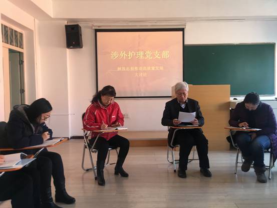 2018年12月19日14时,涉外护理党支部在南岗校区召开全系党员大会,贯彻落实《黑龙江护理高等专科学校开展解放思想推动高质量发展大讨论工作方案》的学习讨论。孙洪波书记主持会议。