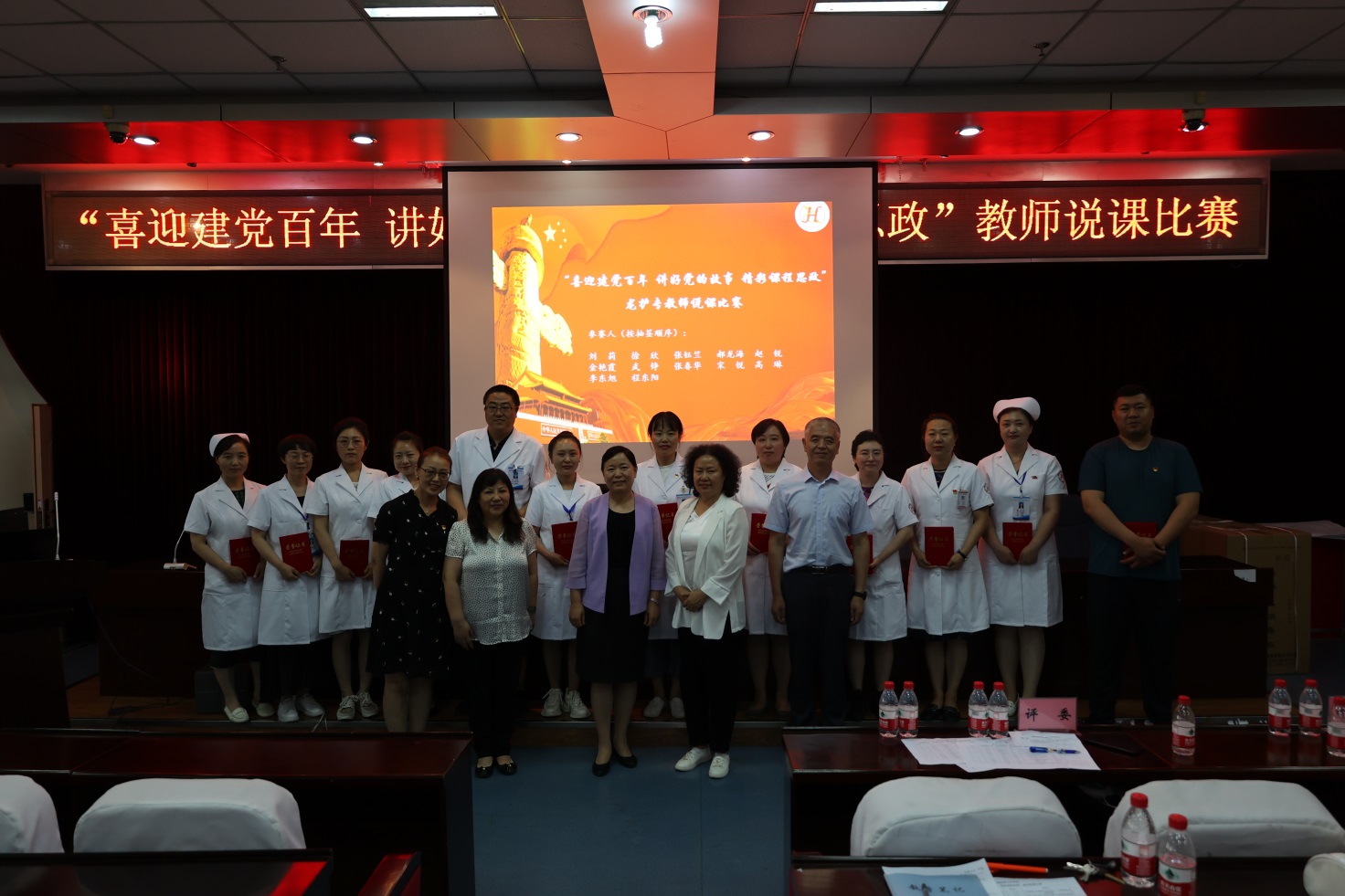 为欢庆伟大的中国共产党建党100周年,为党的百年华诞献礼,围绕学校提质培优行动计划,为深入贯彻实施课程思政,总结凝练课程思政教学成果,打造优秀教学团队,黑龙江护理高等专科学校于2021年6月30日下午在南岗校区开展了“喜迎建党百年,讲好党的故事,精彩课程思政”教师说课比赛活动。来自三个校区的12名教师参加了比赛,参赛教师均为教研室主任,就一门课的课程思政设计展开说课。比赛由督导办主任廖林楠主持。学校教学校长林杰、督导办全体成员、各系部主任、副主任、教研室主任以及课程负责人等在现场观看比赛,其他教师观看在线直播。