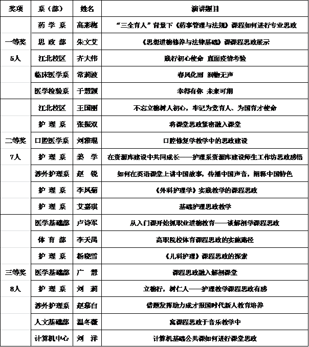 为深入学习贯彻习近平总书记在全国高校思想政治工作会议上的讲话精神,促进我校教师更新教育理念,实施课程思政,同时为了欢庆第36个教师节。2020年9月,黑龙江护理高等专科学校开展“课程思政系列活动”之教师演讲比赛。因疫情原因,为避免聚集,本次演讲比赛采取上交演讲视频形式,全校20名教师报名参赛,由督导办公室组织专家进行评审,共评出一等奖5人,二等奖7人,三等奖8人。