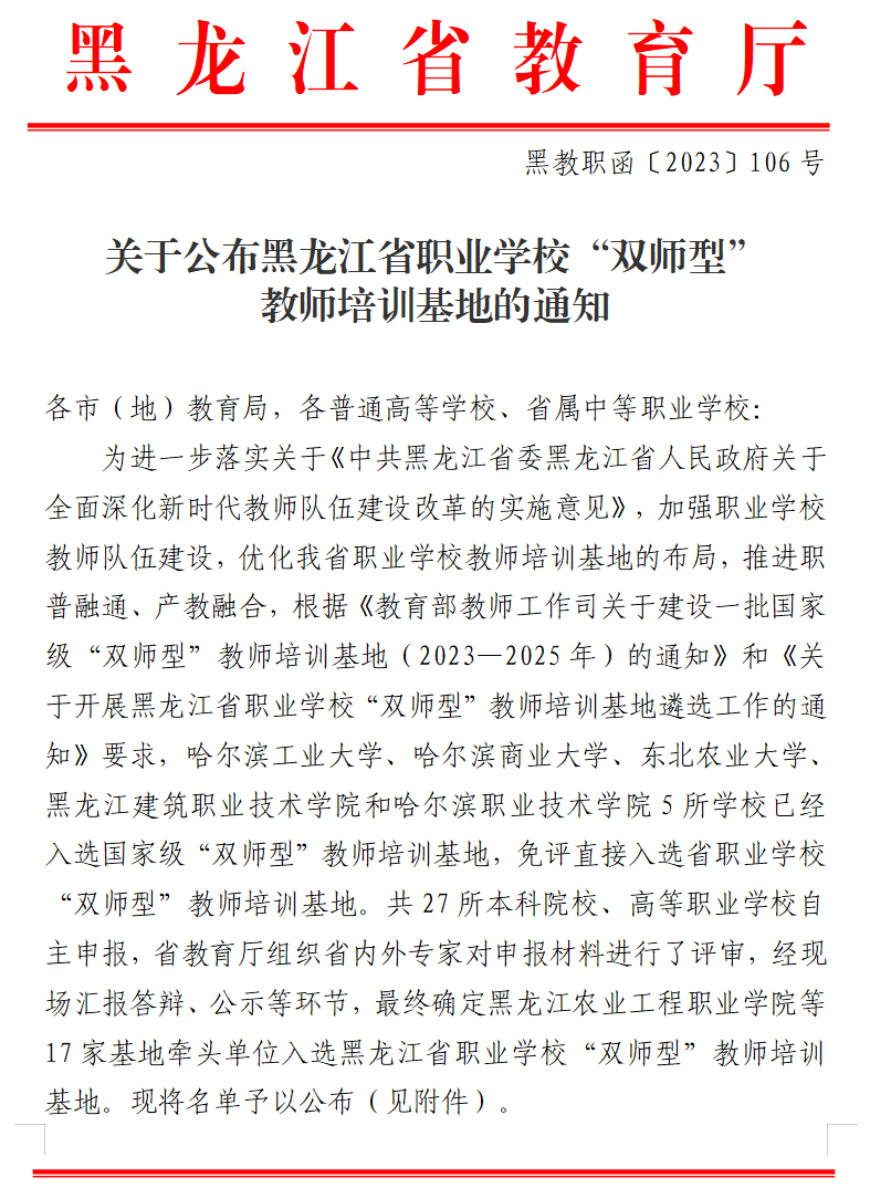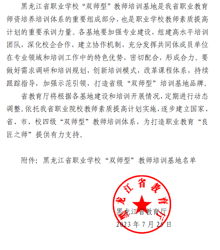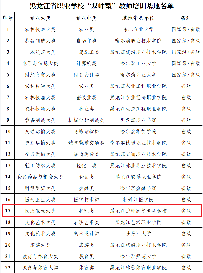7月25日,黑龙江省教育厅官网发布《关于公布黑龙江省职业学校“双师型”教师培训基地的通知》,黑龙江护理高等专科学校成功入选黑龙江省职业学校“双师型”教师培训基地。