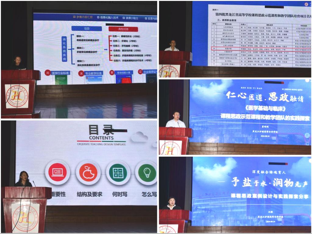 培训会由我校参加黑龙江省职业院校教师教学能力大赛获奖的两支参赛队伍代表,护理系负责人吕波、临床医学系刘博老师,就如何撰写教学实施报告以及省教学能力比赛参赛体会,进行了精彩的汇报,分享了其深刻的教学见解,为教师们提供了宝贵的教学策略和方法。黑龙江省职业院校课程思政示范课程及教学团队负责人代表,护理系常颖颖、医学基础部贾明明、现代教育技术中心汪颖三位老师,分别就省级项目的申报、结题、典型案例培育三方面进行分享,就课程思政案例设计与实践探索进行了汇报,强调了课程思政在立德树人中的核心作用,展现了教师们在教学一线的创新精神和辛勤付出。
