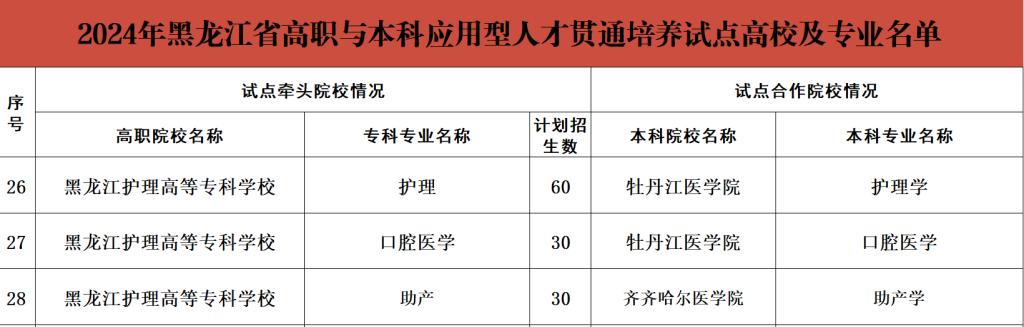 4月25日,黑龙江省教育厅公布了《省教育厅关于公布2024年黑龙江省高职与本科应用型人才贯通培养试点高校及专业名单的通知》,我校获批2024年黑龙江省高职与本科应用型人才贯通培养试点高校;学校护理专业、口腔医学专业与牡丹江医学院继续开展五年制/六年制本科教育“高本贯通”培养,计划录取护理60人,口腔医学30人,助产专业与齐齐哈尔医学院开展五年制本科教育“高本贯通”培养,计划录取30人。