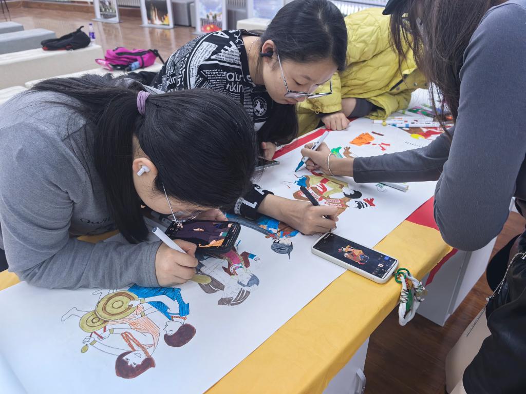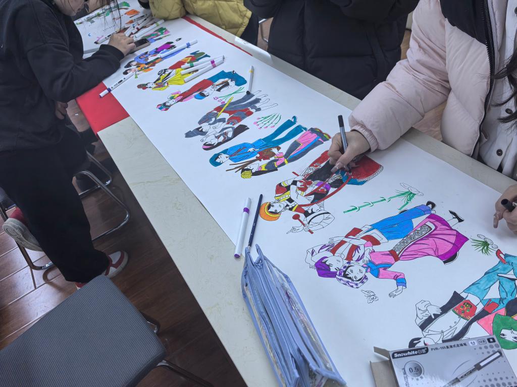 在创作过程中,同学们分工协作,各展所长。他们将对民族文化的热爱与对祖国的深情融入到每一笔每一划之中。从勾勒轮廓到填充色彩,从描绘民族特色元素到展现各族人民携手奋进的场景,无不体现出同学们的创意与匠心。汉族同学凭借扎实的绘画基本功构建框架,少数民族同学则将本民族独特的服饰、舞蹈、传统习俗等文化符号巧妙地展现出来,如蒙古族的豪放、朝鲜族的优雅长鼓、苗族的精美银饰等,让整幅画卷既富有艺术美感又充满民族风情。