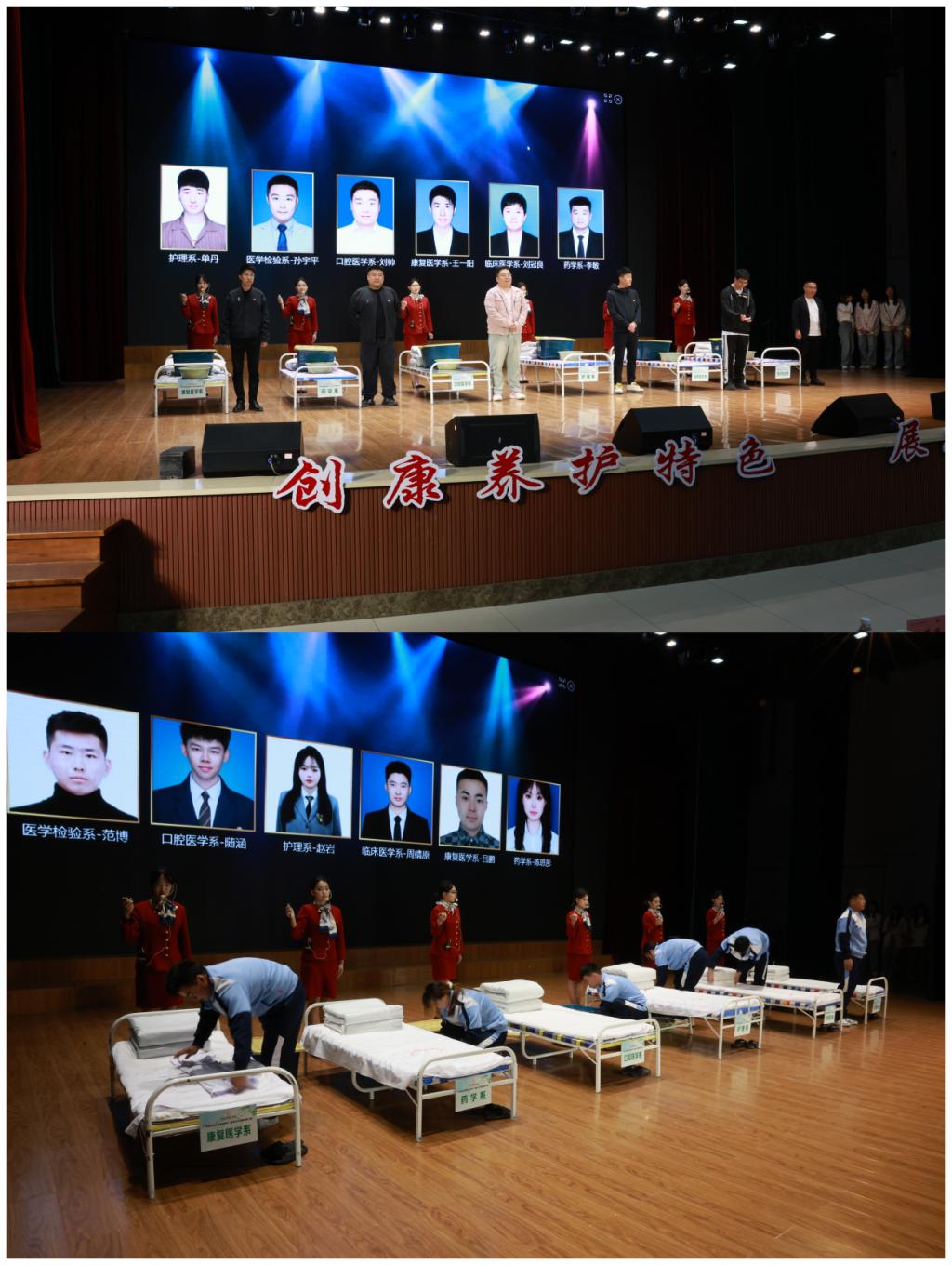 此外,南岗校区、阿城校区、松北校区的书记们分别带来诗朗诵《寝室是我家》、书法展示《最美龙护专》、才艺展示《礼仪之邦》,用深情的演绎和独特的方式,诠释了校园文化与家的哲学;康复医学系的原创歌曲《校忆的诗章》、医学检验系的《时光胶囊》等节目再次将现场气氛推向高潮。
