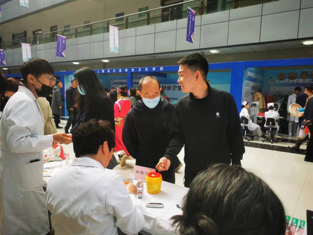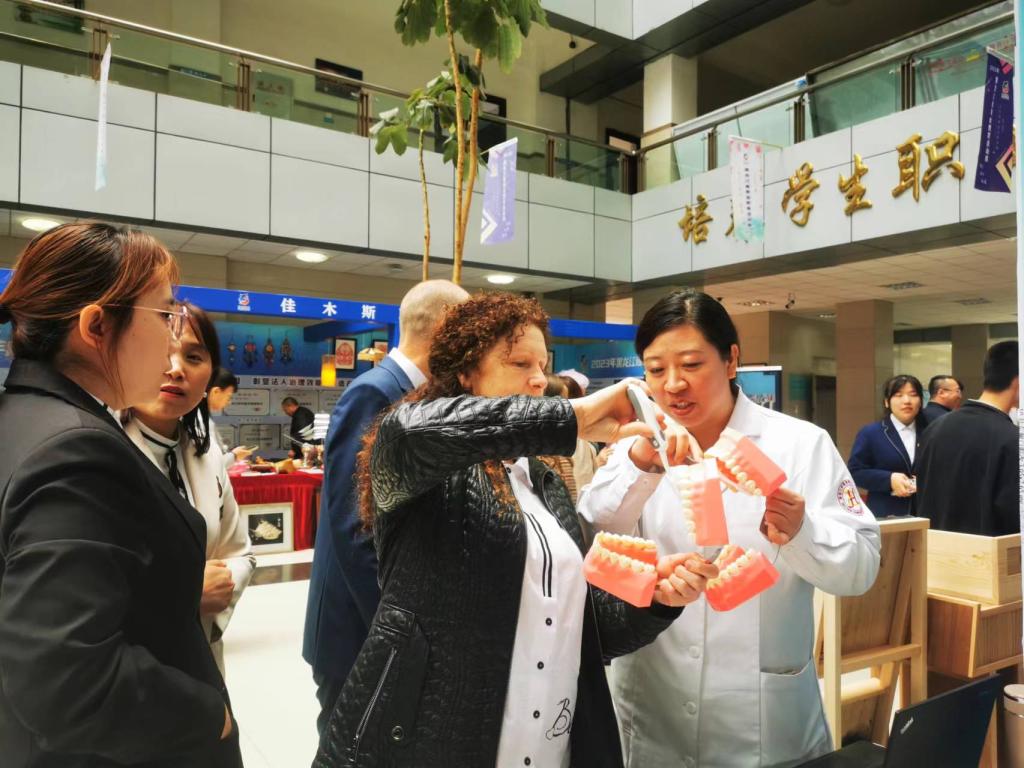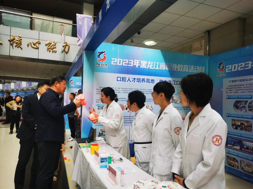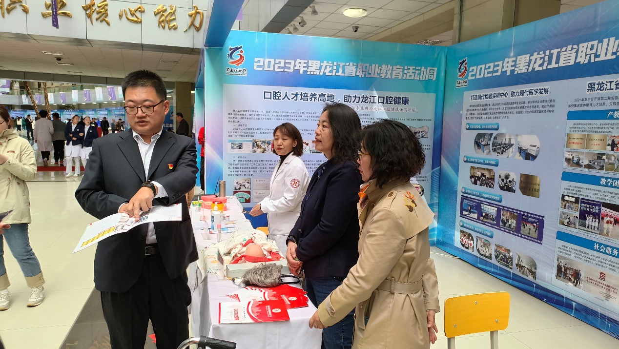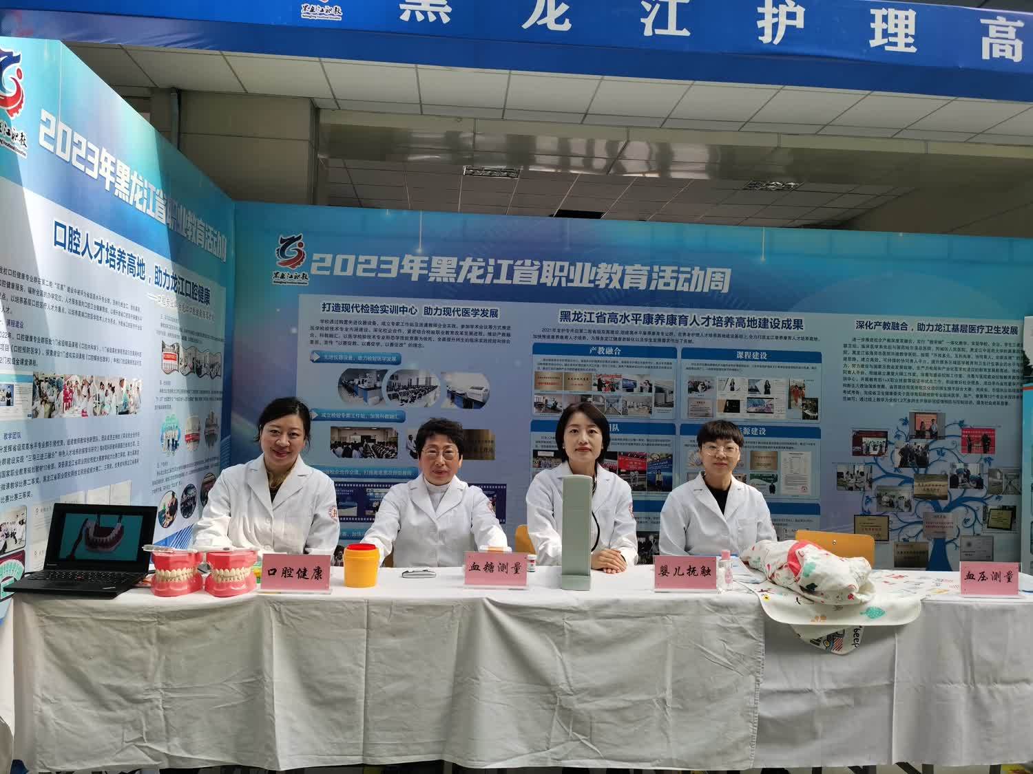 职业教育创新发展成果展上学校将近年来经过全校师生共同努力在双高建设上取得的丰硕成果在大会的统一布展下做了充分展示。活动现场我校组织开展了血糖测试、血压测量、正确刷牙方法指导演示、婴儿抚触演示等公益服务,受到了与会参观代表和参展兄弟单位的关注和好评,尤其是检验系负责人孙革新开展的免费血糖测试,得到不同人群欢迎,受益达150余人。口腔医学系陈慧老师感冒未痊愈,带着略微嘶哑的声音坚持为前来咨询的人群宣教口腔健康知识并现场指导演示,我校朱波老师等几位白衣天使的有效互动成为大会成果展示一道亮丽的风景线,吸引不少兄弟单位与会同仁前来驻足进行切磋交流!