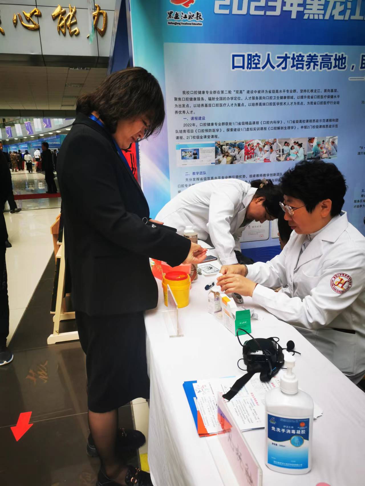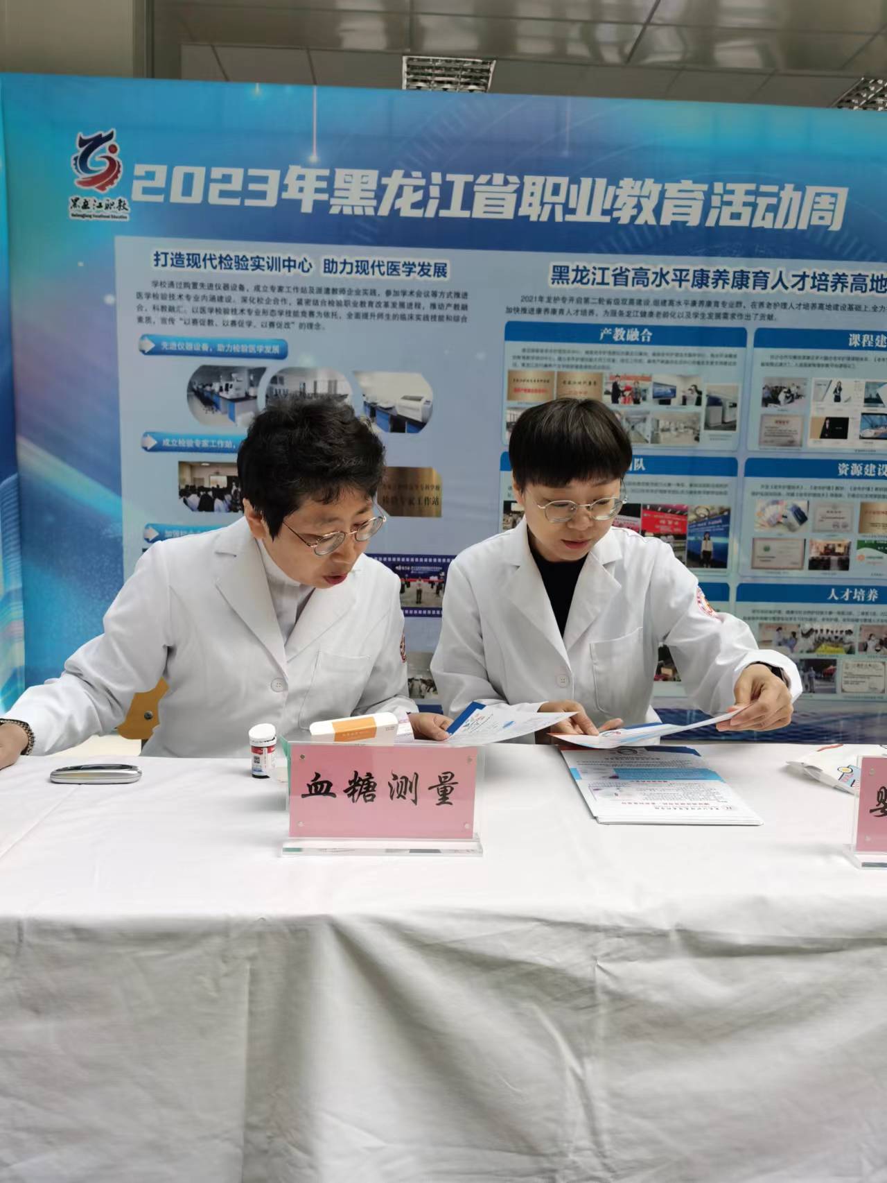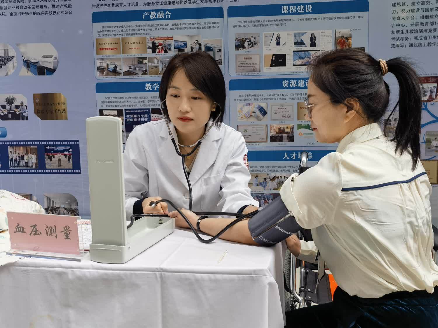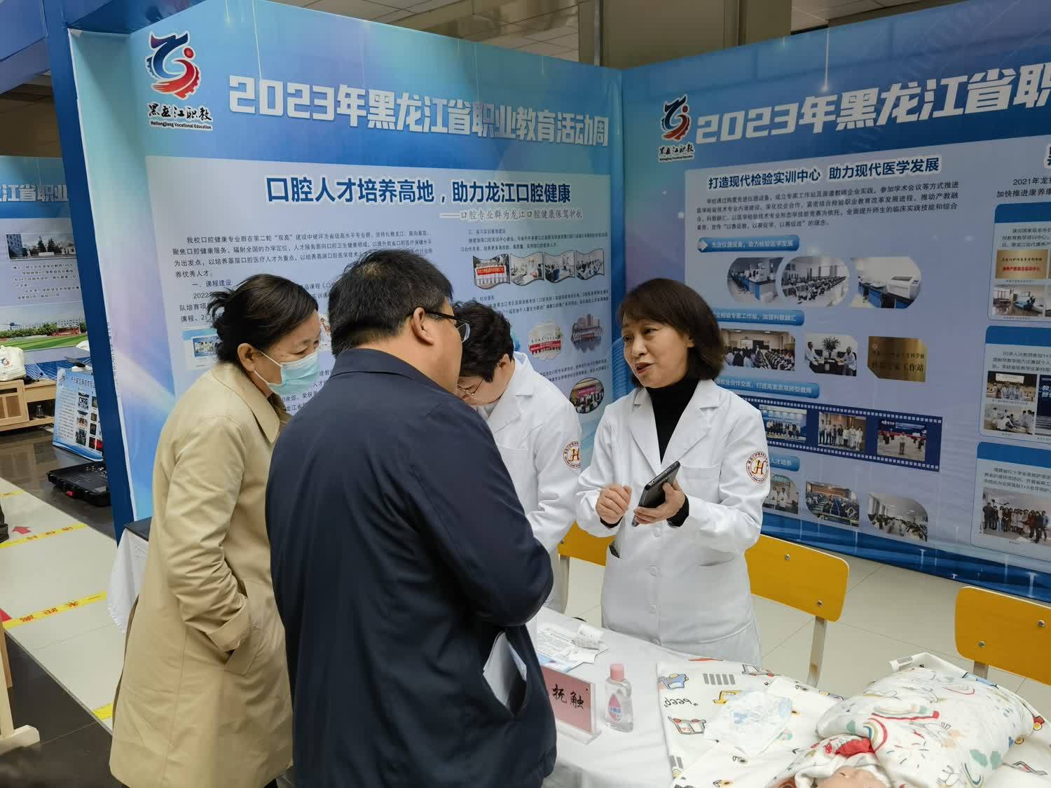 职业教育创新发展成果展上学校将近年来经过全校师生共同努力在双高建设上取得的丰硕成果在大会的统一布展下做了充分展示。活动现场我校组织开展了血糖测试、血压测量、正确刷牙方法指导演示、婴儿抚触演示等公益服务,受到了与会参观代表和参展兄弟单位的关注和好评,尤其是检验系负责人孙革新开展的免费血糖测试,得到不同人群欢迎,受益达150余人。口腔医学系陈慧老师感冒未痊愈,带着略微嘶哑的声音坚持为前来咨询的人群宣教口腔健康知识并现场指导演示,我校朱波老师等几位白衣天使的有效互动成为大会成果展示一道亮丽的风景线,吸引不少兄弟单位与会同仁前来驻足进行切磋交流!