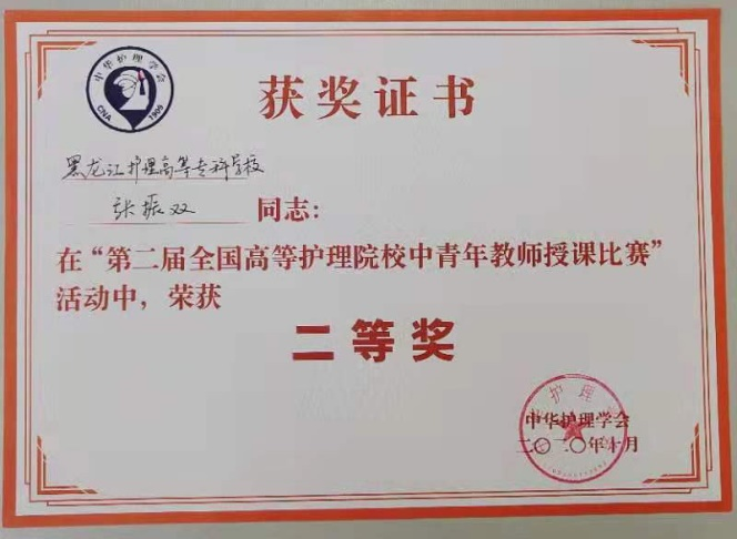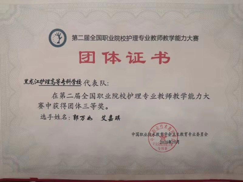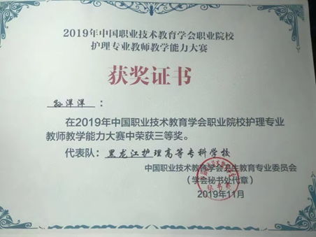 双高建设阶段,高水平骨干专业建设优化了教师结构,提升了教师素质学校建立了校级技能大赛专家工作室和师生工作坊,孙伟、全丹花等年轻教师认真钻研,勤奋工作,引入大赛进课堂机制,形成校、省、国家三级大赛选拔、培养管理制度,独立完成了三届省赛、两届国赛、一届国家试点赛的指导任务,取得省赛第一、国赛、试点赛二、三等奖的佳绩,在全国护理技能大赛中展示了龙护专的风采。同时,担当起全省护士大赛、哈市护士大赛的技术指导,为全省护士岗位技能提升作出了贡献。学生技能大赛2018、2019、2020年获得省级护理技能大赛一等奖4项,2018、2019国赛及2020国家试点赛三等奖4项。