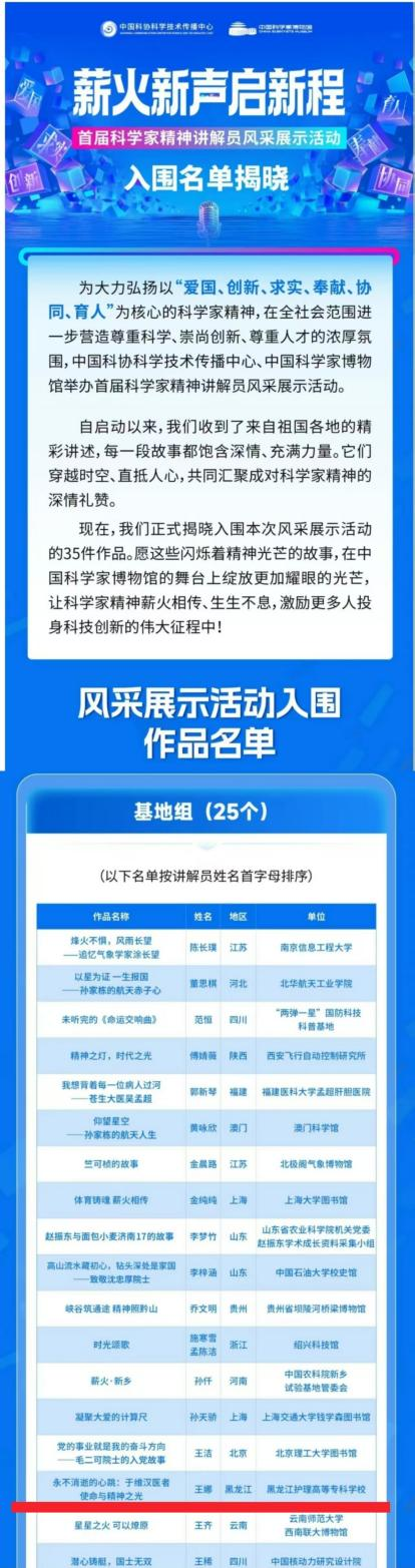 作品围绕科学家精神主题内涵,结合新建于维汉展厅和于维汉史料采集资源,精心打磨于维汉防治克山病的科学家感人故事,受到评审专家认可,受邀参加今年1月25日国家科技传播中心首届科学家精神讲解员风采展示仪式。